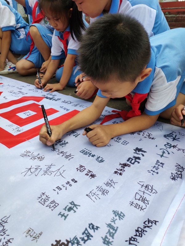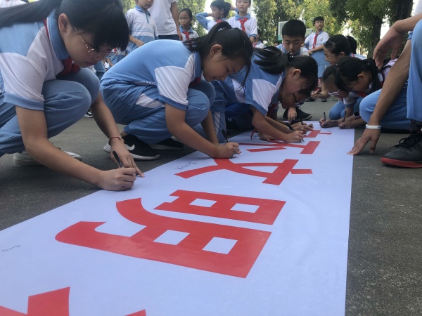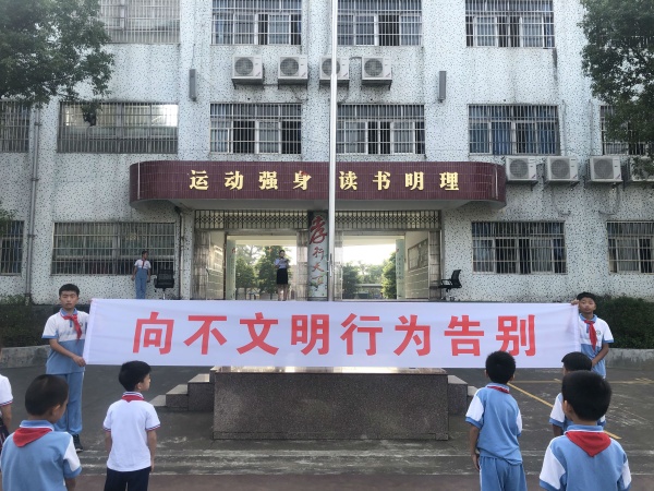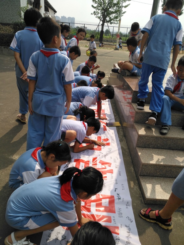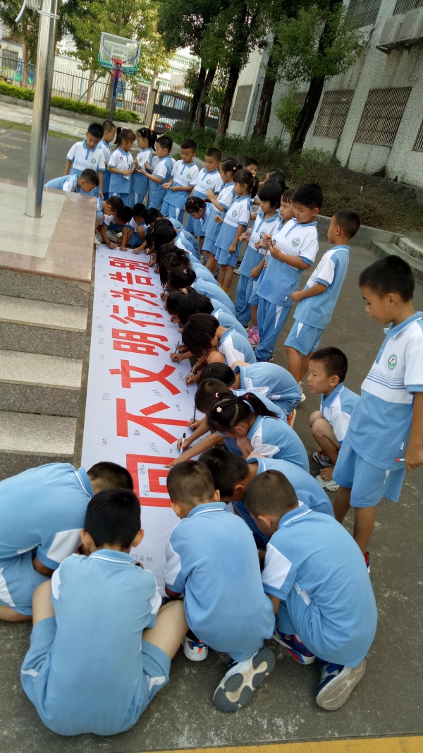 接下來是全校各班學(xué)生代表簽名,在寫著“向不文明行為告別”的橫幅上莊重地簽下了自己的名字。其他同學(xué)都分別按年級(jí)在大隊(duì)部的安排下簽下了全校651名同學(xué)的名字。班主任老師如及時(shí)雨,馬上結(jié)合主題開展了一次非常有針對性的班會(huì)課。