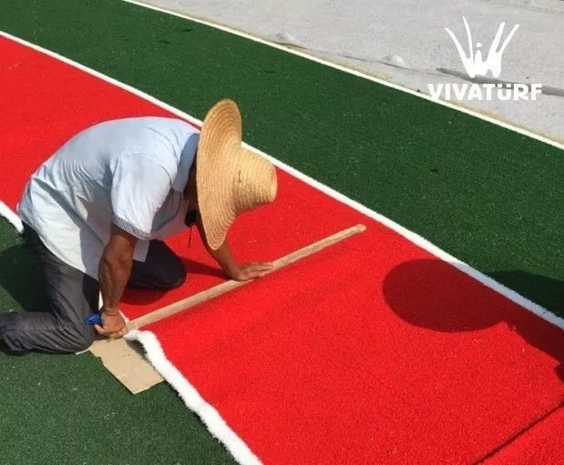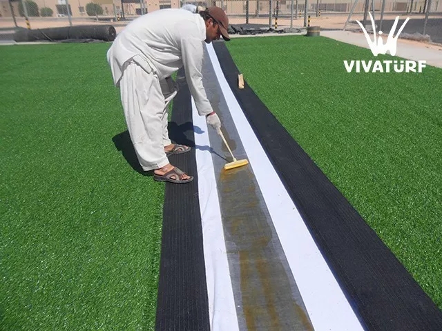人造草坪在拼接過程中掌握好膠水粘接時間,防止草坪粘接劑因長時間未粘合而固化,草坪鋪裝方向保持一致。
