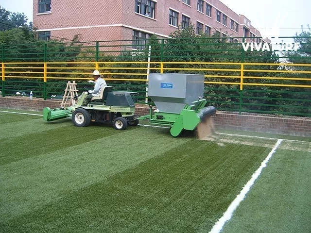 4.填充石英砂與橡膠顆粒,將石英砂填注到人造草坪里,用梳理機梳理草絲,若梳理不了,則采用人工梳理草絲,確保石英砂填充平整,并用相同的方法填充橡膠顆粒。石英砂與橡膠顆粒的注入,可以使草絲直立并增加運動者的舒適感。