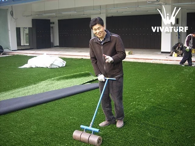 利用專用涂膠工具在人造草坪背面涂膠,涂膠厚度要一樣,不能出現(xiàn)高低現(xiàn)象;涂膠速度要均勻,不能反復(fù)涂膠;在涂膠干燥完成后,進(jìn)行粘合人造草坪粘合完工后,利用專用加壓工具,使人造草坪密實度緊實;之后,進(jìn)行人造草坪清理,人造草坪固化利用三天時間對人造草坪進(jìn)行檢查和修整。