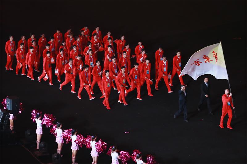 南方網(wǎng)訊 第二屆全國青年運(yùn)動會開幕式于2019年8月8日晚在山西體育中心紅燈籠體育場舉行。在運(yùn)動員入場儀式上,17歲的游泳小將黃俊毅擔(dān)當(dāng)廣東代表團(tuán)旗手,紅旗飄揚(yáng),精神抖擻。