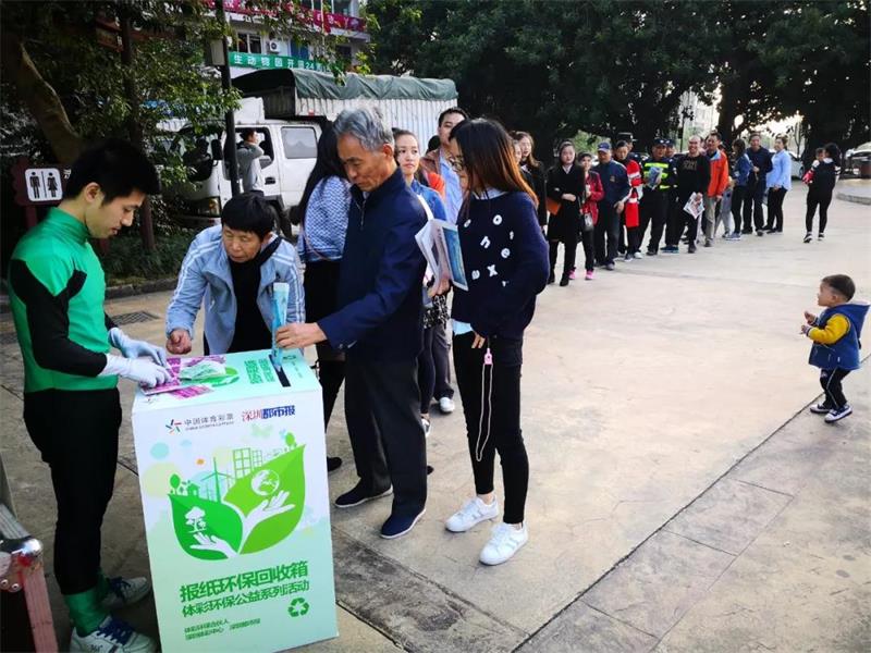 在2017年,深圳體彩還舉行了“循環(huán)閱讀 愛(ài)心回爐 2017深圳體彩環(huán)保公益行動(dòng)”,活動(dòng)在人流密集的地鐵站內(nèi)進(jìn)行,由專(zhuān)人引導(dǎo)地鐵乘客對(duì)免費(fèi)領(lǐng)取的報(bào)紙進(jìn)行定點(diǎn)回收,以呼吁市民對(duì)報(bào)紙、書(shū)刊等紙質(zhì)讀物進(jìn)行二次回收,實(shí)現(xiàn)循環(huán)閱讀,傳達(dá)“每回收200份報(bào)紙,就能拯救一顆小樹(shù)”的環(huán)保理念,共有3000余人領(lǐng)取了體彩制作的“環(huán)保公約卡”。