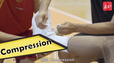 Compression(加壓)是減少腫脹的手段之一,可通過鞋帶等加壓。Elevation(抬高)是減少腫脹的另一種手段,受傷后千萬記得晚上睡覺時一定要把腿抬高。
