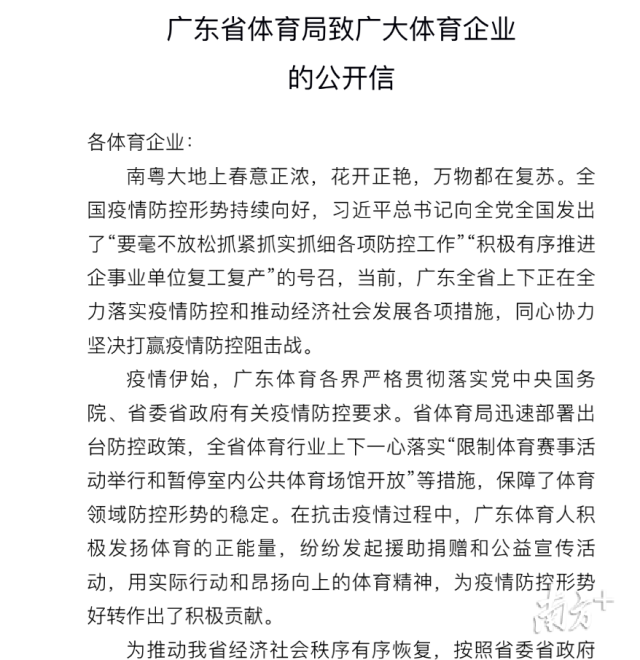 3月27日,廣東省體育局在致廣大體育企業(yè)的公開信中表示,接下來將進(jìn)一步抓好國(guó)家和省已有政策措施的落實(shí)落地;進(jìn)一步推動(dòng)金融支持和服務(wù)保障工作;進(jìn)一步做好助力復(fù)工復(fù)產(chǎn)的支持與宣傳工作……