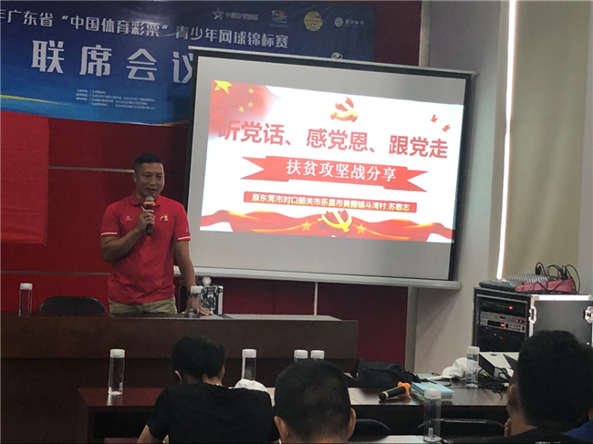 2020年8月23日上午,中共黨員、原東莞市對口幫扶韶關(guān)樂昌市黃圃鎮(zhèn)斗灣村駐村工作隊隊長、2020年省青少年網(wǎng)球錦標(biāo)賽副裁判長蘇敷志同志在賽區(qū)作了“精準(zhǔn)扶貧攻堅戰(zhàn)分享”的主題宣講,全體裁判員及工作人員近70人參與活動。
