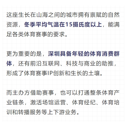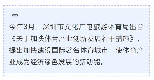 去年8月,《中共中央國(guó)務(wù)院關(guān)于支持深圳建設(shè)中國(guó)特色社會(huì)主義先行示范區(qū)的意見(jiàn)》正式發(fā)布,其中指出:“支持深圳舉辦國(guó)際大型體育賽事和文化交流活動(dòng),建設(shè)國(guó)家隊(duì)訓(xùn)練基地,承辦重大主場(chǎng)外交活動(dòng)。”