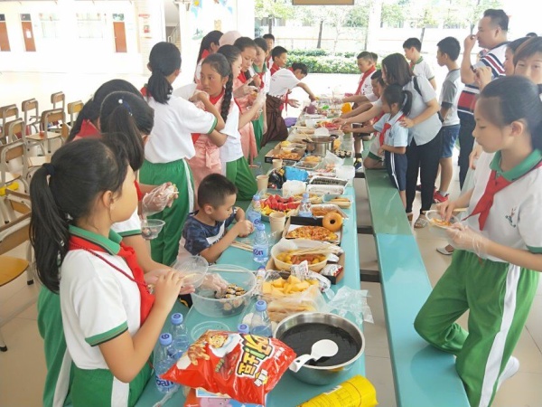 歡樂的同時怎么能少得了美食。活動現(xiàn)場,中心小學的家長們?yōu)檫h方的朋友送上了各種美味家鄉(xiāng)小吃:金黃的煎堆、色香味俱全的腸子魚蛋、款式各異的馬蹄糕、清熱解毒的涼粉、風味十足的芋頭糕……孩子們你一塊,我一塊,美美地品嘗起來,其樂融融。