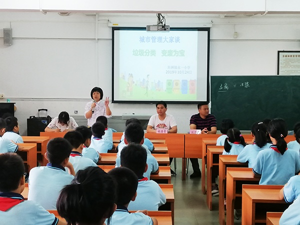 活動以“垃圾分類、變廢為寶”為主題,邀請志愿者、家長和師生代表齊聚一堂,聚焦垃圾分類話題,群策群力,凝聚社會共識。家長代表劉昌鴻就“什么是垃圾”、“ 什么是垃圾分類”、“如何進(jìn)行垃圾分類”以及“垃圾處理的現(xiàn)狀”等方面,為同學(xué)們進(jìn)行詳細(xì)的講解。志愿者代表林繼青則針對“如何收集”、“ 如何回收再利用”等方面進(jìn)行指導(dǎo)。在隨后的互動環(huán)節(jié),同學(xué)們把自己對垃圾分類或者回收再利用等方面的疑惑提出來,與在場的家長、志愿者以及教師們一起探討。部分老師和學(xué)生還跟大家分享了自己對垃圾分類的理解與做法。最后,活動主持人號召全體學(xué)生:積極參與垃圾分類、變廢為寶,爭當(dāng)環(huán)保小衛(wèi)士!學(xué)生們則以熱烈的掌聲和響亮的“好”字作出了回應(yīng)。