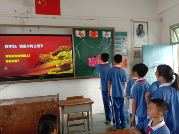 通過(guò)分享英雄故事,方老師引導(dǎo)同學(xué)們提煉出一個(gè)共同點(diǎn):他們“熱愛(ài)人民,熱愛(ài)祖國(guó),為人民謀幸福,為祖國(guó)謀發(fā)展”。有這么多的英雄為了我們現(xiàn)在的美好生活前仆后繼,不斷進(jìn)取,不畏艱難困苦,奮勇拼搏!這也自然而然地升華了同學(xué)們的愛(ài)國(guó)情感,同學(xué)們紛紛覺(jué)得:作為中華人民共和國(guó)的一份子,生活在這樣一個(gè)越來(lái)越強(qiáng)大的祖國(guó)中,我們倍感驕傲、幸福與自豪!為了抒發(fā)同學(xué)們對(duì)祖國(guó)母親的愛(ài),全班集體朗誦《我崇拜英雄》,并在卡紙上寫(xiě)下自己將成為怎樣的人,如何實(shí)現(xiàn)?同學(xué)們都無(wú)限地感慨:我們要將自己的理想與中華民族偉大復(fù)興夢(mèng)相結(jié)合,努力提升自身素質(zhì),豐富知識(shí),開(kāi)拓眼界,心懷民族,向英雄們看齊!
