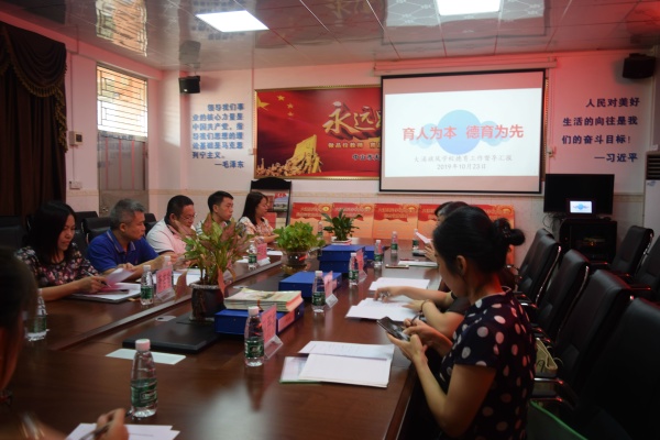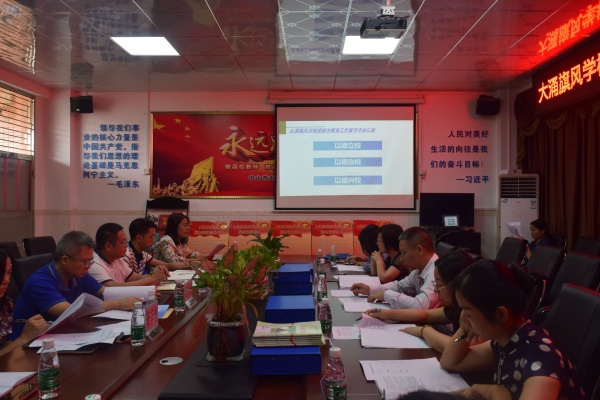 首先羅柳副校長(zhǎng)帶著督導(dǎo)小組參觀了學(xué)校整潔優(yōu)美的校園環(huán)境,并一一介紹了校園文化建設(shè)、教學(xué)樓道建設(shè)的特點(diǎn),接著由德育主任楊江鳴介紹了初中部教學(xué)樓樓道建設(shè)的特點(diǎn),每走過(guò)一個(gè)樓層時(shí)都能聽(tīng)見(jiàn)督導(dǎo)小組的成員對(duì)大涌旗風(fēng)學(xué)校文化布置的贊賞。隨后集中于會(huì)議室,先由南區(qū)德育專干李亞利進(jìn)行了簡(jiǎn)單的介紹后,接著蕭若瑜專干也一一介紹了大涌旗風(fēng)學(xué)校的老師。隨后由羅柳副校長(zhǎng)就學(xué)校近年辦學(xué)理念、辦學(xué)常規(guī)、教研教改及校園特色文化建設(shè)等多項(xiàng)工作及取得的成績(jī)進(jìn)行了簡(jiǎn)單的匯報(bào),從“寓德育于管理之中的抓組織領(lǐng)導(dǎo)”到“寓德育于隊(duì)伍建設(shè)之中的師德師風(fēng)建設(shè)”到“寓德育于課程管理之中德育課程標(biāo)準(zhǔn)”然后到“寓德育于活動(dòng)之中的踐行社會(huì)主義核心價(jià)值觀”再到“寓德育于特設(shè)校園建設(shè)之中的走特色辦學(xué)之路”最后就是“德育經(jīng)費(fèi),渠道暢通、經(jīng)費(fèi)充足,保障供給”,德育是有擔(dān)當(dāng)?shù)纳罱逃?,各校區(qū)堅(jiān)持以德育特色為引領(lǐng),著力良好的德育環(huán)境建設(shè)。讓學(xué)生們?yōu)橛欣硐?、有道德、有文化、有紀(jì)律的、德智體美勞全面發(fā)展的新一代小學(xué)生。精彩的匯報(bào)贏得在場(chǎng)各位領(lǐng)導(dǎo)的陣陣掌聲。