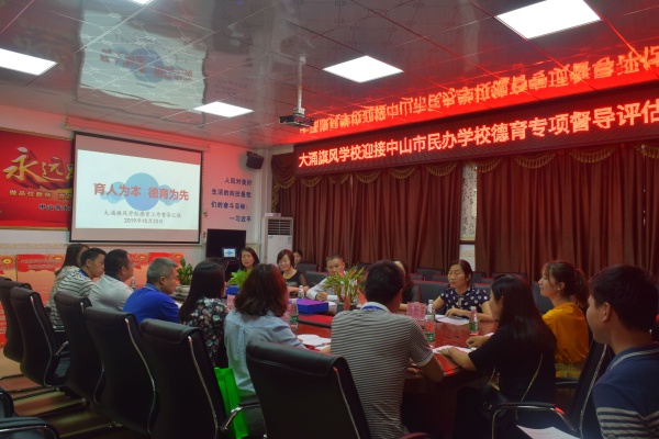 2019年10月23日下午,中山市南區(qū)教育指導(dǎo)中心及南區(qū)民辦學(xué)校的德育主任組成的督導(dǎo)評(píng)估小組蒞臨中山市大涌旗風(fēng)學(xué)校進(jìn)行督導(dǎo)評(píng)估,由大涌鎮(zhèn)教育事務(wù)指導(dǎo)中心民辦教育專干鄭凱旋、德育專干蕭若瑜、以及大涌旗風(fēng)學(xué)校嚴(yán)丙武常務(wù)校長(zhǎng)、葉莉主任、小學(xué)部蔡金艷校長(zhǎng)、初中部章榮發(fā)校長(zhǎng)、小學(xué)部羅柳德育副校長(zhǎng)、初中部楊江鳴德育主任及各行政的陪同下進(jìn)行素質(zhì)教育督導(dǎo)評(píng)估檢查。