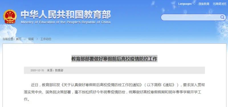 《通知》強調,要引導師生做好返鄉(xiāng)和居家期間疫情防控。要加強與生源所在地的政策對接,對從出現(xiàn)疫情地區(qū)返回的學生等重點人群做好防控監(jiān)測。要加強寒假期間校園疫情防控。各地和高校要加強寒假期間值班值守,按“一人一檔”跟蹤掌握留校師生健康狀況,科學精準做好疫情防控工作。