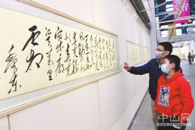 1月1日上午,由市文化廣電旅游局主辦的“新的征程——黑子、陽子毛體書風中山展”在中山美術(shù)館拉開序幕,展覽將持續(xù)至1月5日,市民可免費觀展。市委常委、宣傳部部長林銳熙出席開幕儀式。圖為家長向孩子講解書法中的含義。