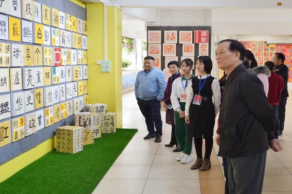 從充滿書詩清氣的詩禮文化長廊,到處處都是學(xué)習(xí)楷模的感恩廳,從稚嫩或精致或磅礴或大氣的師生書法作品的書法長廊,到精心打造而又極具特色的黨建文化長廊,校園文化小小解說員聲情并茂,讓各位嘉賓清晰而深入地感受校園文化的特色。當(dāng)走到藝術(shù)作品長廊,大家都不禁眼前一亮,極富創(chuàng)意的“海鮮街”,以“國歌”為主題的篆刻作品 、以“快樂童年”為主題的粘土手工、以“民族大團(tuán)結(jié)”為主題的錫鉑畫、以“獅情畫意”為主題的國畫作品,還有彩繪燈籠、線描作品 、卡通畫 、彩塑作品 、書法作品、兒童畫等等,內(nèi)容之充實(shí),形式之多樣,把各位嘉賓的眼光緊緊吸引住。大家紛紛停下了腳步,在小小解說員的指引下,細(xì)細(xì)地欣賞著孩子們的藝術(shù)作品。