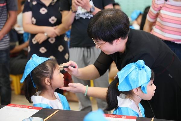 額點(diǎn)朱砂啟智慧——陣陣古琴曲聲中,家長、老師們擎起朱砂筆,師生攜手啟迪智慧, 輕輕一點(diǎn),一個個鮮紅的圓點(diǎn)印記在孩子稚嫩的額頭上,多么明亮,多么鮮艷。