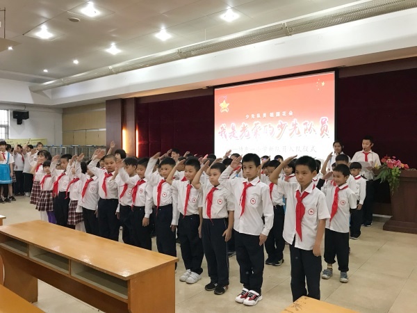 新隊員的入隊儀式在學(xué)校五樓階梯室舉行。隨著主持人的致辭,入隊儀式拉開了帷幕!在出旗曲響起之際,同學(xué)們難掩激動的心情,面向隊旗,嘹亮的隊歌聲回蕩在階梯室。在大隊輔導(dǎo)員梁雯筠老師宣讀了新隊員名單后,125名新隊員踏著歡快的步伐,分批上前接受六年級優(yōu)秀隊員代表們?yōu)樗麄兣宕魃硝r艷的紅領(lǐng)巾。在大隊長冼麗詩同學(xué)的帶領(lǐng)下,在鮮艷的隊旗見證下,新隊員肅然起敬,高舉右手,聲音整齊而激昂地宣誓和呼號。接著,一年級優(yōu)秀隊員代表作了激情發(fā)言,輔導(dǎo)員梁老師也發(fā)表了熱情洋溢的講話,祝賀新隊員光榮入隊,同時也希望新隊員能好好學(xué)習(xí),爭取全面發(fā)展。最后,在退旗曲聲中,入隊儀式圓滿結(jié)束。