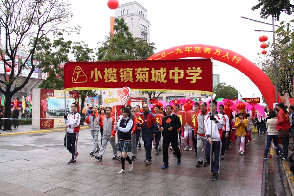早上9點30分左右,隨著鎮(zhèn)黨委書記梁榮佳一聲“小欖鎮(zhèn)2019年慈善萬人行起步”,慈善萬人行正式開始。在學校黨支部書記王永月校長率領下,菊城中學方陣個個精神抖擻,有的揮舞著小彩旗,有的手拿愛心標語,有的高舉紅色燈籠,有的手揮彩色扇子,有的手舉彩色花傘,有的身背綠色荷葉,在沿途觀看群眾的助興下,高呼愛心口號,變換道具造型,為公益慈善事業(yè)邁步前行。