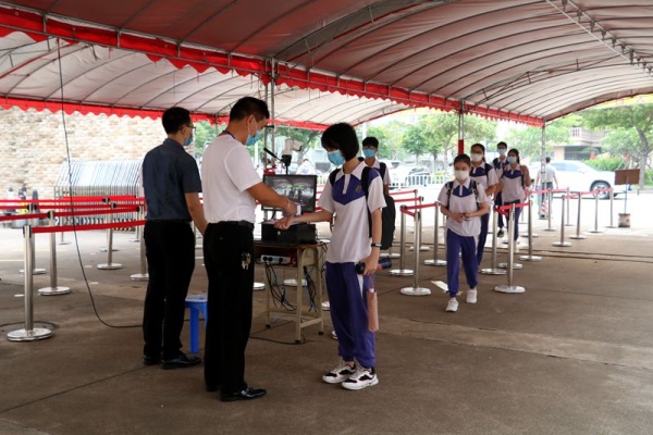 7點(diǎn)正,永寧中學(xué)校門打開,學(xué)生們間隔一米距離有序在測溫儀前通過,進(jìn)入學(xué)校。學(xué)校設(shè)置了3條單車和2條人行自動測溫通道,1條人工測溫道,確保師生進(jìn)校通道暢通。部分在測溫儀上顯示體溫異常的學(xué)生,老師會幫他們再測一次體溫。進(jìn)入教室前,每個班級還會有2名晨檢員負(fù)責(zé)再測一次體溫并記錄,同時(shí)每位同學(xué)都會用教室門口擺放的免洗消毒液擦手。