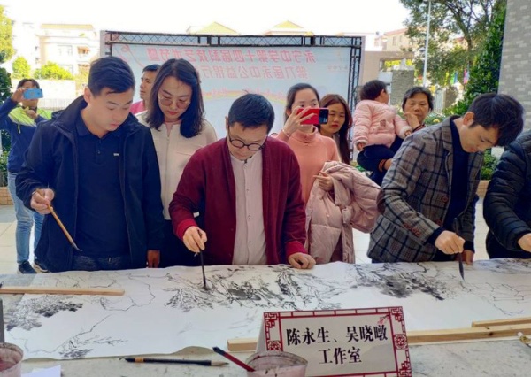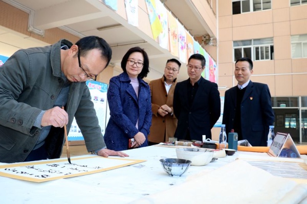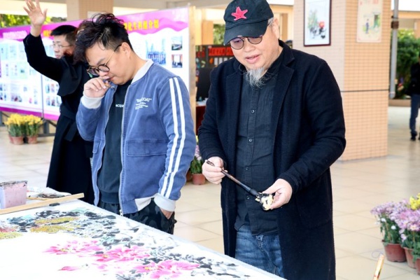 永寧中學人頭攢動,嘉賓云聚。小欖鎮(zhèn)黨委張曉陽委員、文體教育局盧穎禧局長等政府領導來了;永寧社區(qū)劉琴副書記等社區(qū)領導來了;小欖鎮(zhèn)華僑中學歐潤添校長等多個兄弟學校的校長來了;李志平、陳永生、吳曉暾等書畫工作室的大師來了;永寧中學的退休老師回來了;校友、學生家長也來了……真可謂高朋滿座!