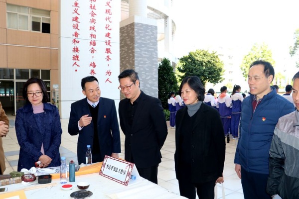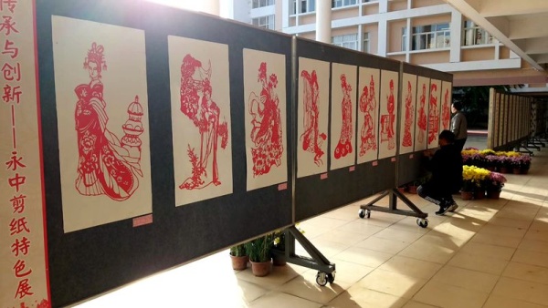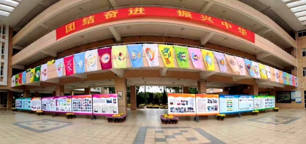 永寧中學教學樓一樓風雨長廊人群比肩接踵,絡繹不絕。這里陳列著“永寧中學教育教學成果”展板,“團隊建設與科組文化”、“永中特色剪紙”、“軟筆書法展示”、“電腦繪畫”等展示板前吸引著賓客們駐足觀賞。熱轉(zhuǎn)印杯藝,目不暇接;眼花繚亂的飛旋魔方,讓人拍手叫絕;語文組抑揚頓挫、鏗鏘悅耳的朗誦,讓人贊嘆不已……