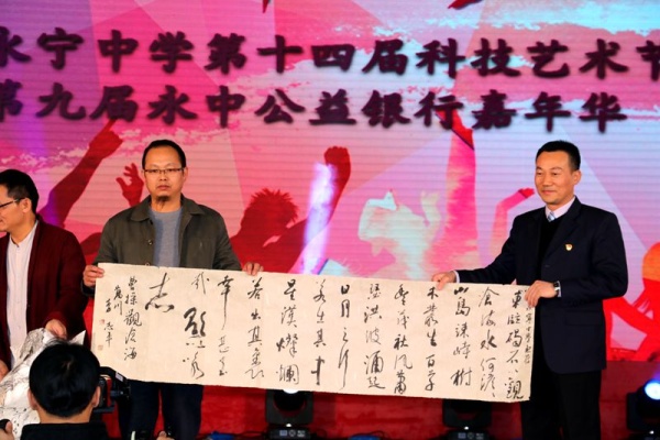 下午3:00,永寧中學第十四屆科技藝術(shù)節(jié)開幕式在學校體育館舉行。小欖鎮(zhèn)文體教育局盧穎禧局長和永寧中學陳清茂校長分別為活動致辭,衷心希望永中科技藝術(shù)節(jié)越辦越出色,教育教學成績年年有新喜報。李志平、陳永生、吳曉暾等書畫工作室大師們將現(xiàn)場潑墨揮毫的墨寶贈送給永寧中學,祝愿永中教育事業(yè)蒸蒸日上!