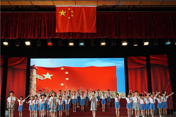 隨后,現(xiàn)場全體人員面向國旗,高舉右拳,在洪智躍老師的帶領(lǐng)下高呼:“祖國萬歲”,口號(hào)聲響徹館場,抒發(fā)了廣源學(xué)校師生對(duì)黨和祖國無比熱愛的豪邁情懷。學(xué)校小杜鵑合唱團(tuán)和四(5)班的同學(xué)以歌聲與朗誦為祖國母親的生日獻(xiàn)禮,豪情滿懷的聲音,如海、如潮,使人精神振奮、思潮澎湃。