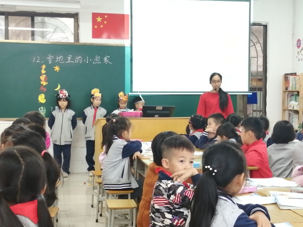 第1團隊的李冬榮老師在《 雪地里的小畫家》一課的教學(xué)中,根據(jù)一年級學(xué)生的特點,給予學(xué)生充分的課堂展示,通過個人讀、男女生分組讀、自然小組讀的形式讓學(xué)生在讀中培養(yǎng)語感,在讀中體會,在讀中理解,在讀中想象,在讀中得到美的熏陶和情感的升華。其中,課本劇的展演環(huán)節(jié)把這節(jié)課推向高潮,評委們不由自主地把掌聲送給可愛的孩子們。