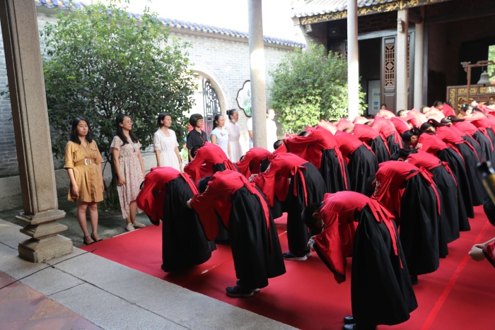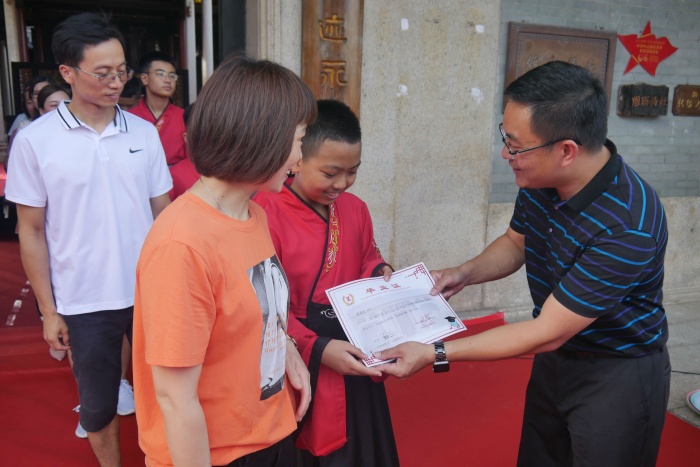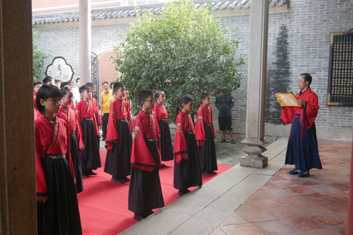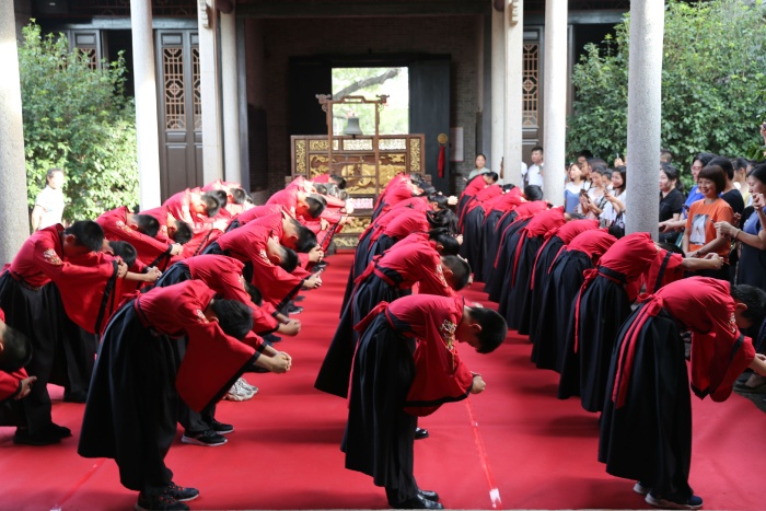 當(dāng)天下午4:30,在具有147年歷史的煙洲書(shū)院門(mén)前,98名小學(xué)畢業(yè)生身穿紅黑搭配的漢服,顯得特別有精神。今年的畢業(yè)禮打破以歌舞、相聲、小品等形式為主的畢業(yè)典禮模式,改為突出傳統(tǒng)“禮”的感恩儀式。活動(dòng)先由黃文華校長(zhǎng)致詞,他語(yǔ)重深長(zhǎng)地說(shuō):“同學(xué)們,感恩會(huì)讓我們發(fā)現(xiàn)生命的富有和多彩,感恩會(huì)讓我們領(lǐng)悟生活的饋贈(zèng)和恩典。讓我們心懷感恩,用愛(ài)回報(bào)身邊的每一個(gè)人……”校長(zhǎng)意味深長(zhǎng)、熱情洋溢的話語(yǔ),激勵(lì)著在場(chǎng)的所有人。優(yōu)秀家長(zhǎng)和優(yōu)秀學(xué)生代表分別致詞,他們發(fā)言完畢,六年級(jí)(1)班和六年級(jí)(2)班分別進(jìn)入書(shū)院中堂行“感恩之禮”。99名學(xué)生在羅勇志老師帶領(lǐng)下,一拜先師孔子,二拜父母,三拜恩師,誦讀了《弟子規(guī)》和《少年中國(guó)說(shuō)》,場(chǎng)面莊嚴(yán)肅穆又高昂激蕩,感人至深,不少學(xué)生和家長(zhǎng)悄悄流下了依依不舍的淚水。禮拜結(jié)束后,家長(zhǎng)領(lǐng)著自己的孩子走出書(shū)院大門(mén),就像他們6年前領(lǐng)著孩子進(jìn)入煙洲小學(xué)一樣,來(lái)到舞臺(tái)上接過(guò)校長(zhǎng)頒發(fā)的畢業(yè)證書(shū)和紀(jì)念品,臉上洋溢著幸福的笑容。最后,孩子們通過(guò)一個(gè)詩(shī)歌朗誦的節(jié)目告別母校,并向國(guó)旗宣誓:我們將不負(fù)母校的期盼,不負(fù)恩師的厚望,全力以赴,再創(chuàng)輝煌!?