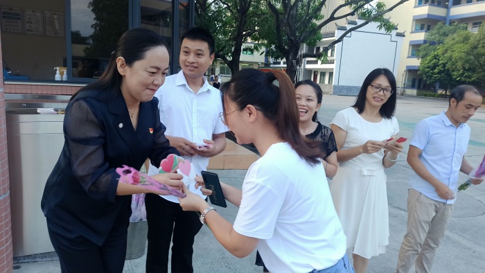 “三寸粉筆,三尺講臺系國運(yùn);一顆丹心,一生秉燭鑄民魂。”在第36個教師節(jié)到來之際,聚星學(xué)校舉行了形式新穎、內(nèi)容豐富的慶?;顒?,為辛勤的老師們送上了一份誠摯的祝福。一朵鮮花,一張校長親手書寫的賀卡,……這些小小的禮物是聚星學(xué)校給每一位老師的最溫馨的祝福。教師節(jié)這天一大早,黨支部書記、校長路海云,早已帶著幾位行政恭迎每位教師的到來。當(dāng)老師走到校門口的時候,校領(lǐng)導(dǎo)就把小禮品送到老師手上,并獻(xiàn)上最親切的祝福:“祝您教師節(jié)快樂!”,老師們欣喜地接過學(xué)校送來的祝福,臉上都洋溢著幸福的笑容。