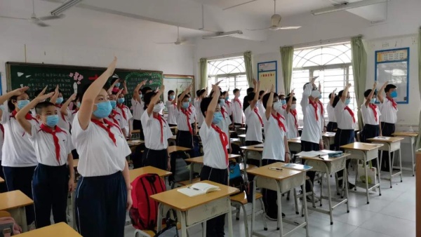 疫情防控之下, “復學第一課” 活動主題采取了釘釘直播的模式,由莫秀紅副校長主持。升旗儀式上,當國歌緩緩響起,同學們整齊地佩戴著紅領巾,莊嚴佇立,注視著屏幕上冉冉升起的國旗。