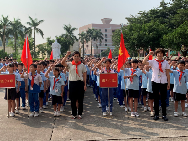 隨著雄壯高昂的旋律響起,學(xué)生們高唱少年先鋒隊(duì)隊(duì)歌,嘹亮的歌聲表達(dá)了大家對(duì)少先隊(duì)組織的熱愛(ài)與自豪感。在鮮艷的隊(duì)旗下,大隊(duì)輔導(dǎo)員陳燕坪老師帶領(lǐng)新隊(duì)員莊嚴(yán)宣誓,隊(duì)員們右拳緊握,大聲表達(dá)決心。