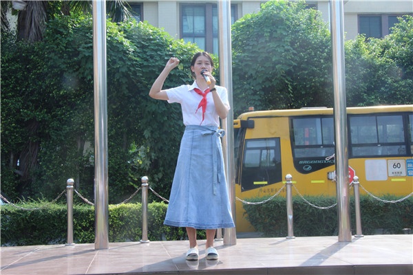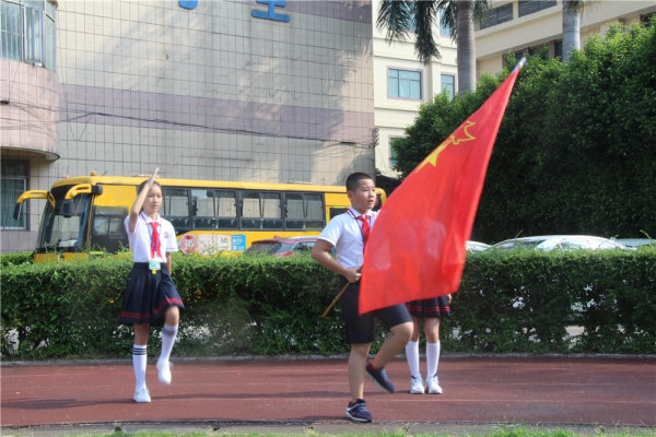 新長(zhǎng)江慶祝建隊(duì)70周年的主題儀式活動(dòng)在朝氣蓬勃的《出旗曲》中拉開(kāi)了帷幕。三名大隊(duì)委踏著堅(jiān)實(shí)的步伐出隊(duì)旗,操場(chǎng)中的少先隊(duì)員們向隊(duì)旗敬隊(duì)禮,整個(gè)出旗儀式莊重而嚴(yán)肅。隨后七年級(jí)二班的大隊(duì)委林夏錫走上旗臺(tái)指揮所有少先隊(duì)員唱隊(duì)歌。