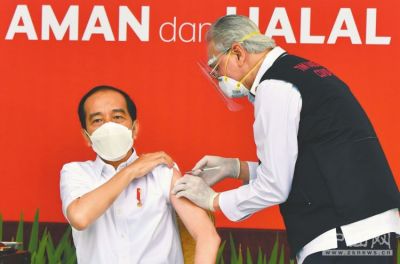 1月13日,在印度尼西亞雅加達總統(tǒng)府,印度尼西亞總統(tǒng)佐科接種新冠疫苗。新華社 發(fā)