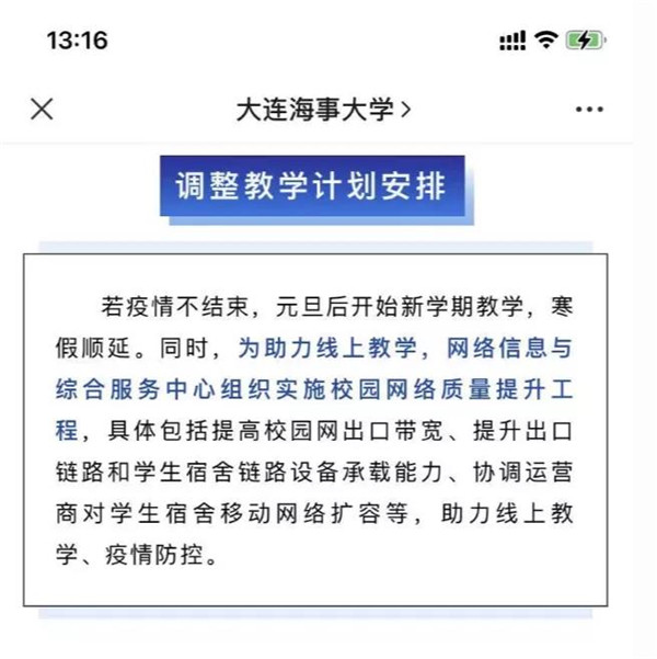 大連海事大學公眾號于2020年12月26日發(fā)布“致全校師生的一封信”稱,目前全體師生的核酸檢測結(jié)果均為陰性,至1月4日,若疫情還未結(jié)束,學校將開啟新學期教學安排,寒假向后順延。