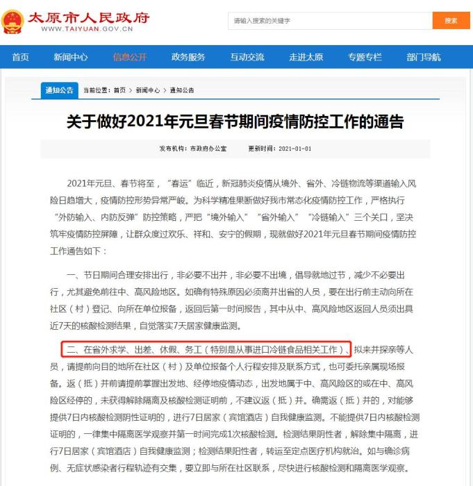 如山西太原市要求,在省外求學(xué)、出差、休假、務(wù)工(特別是從事進(jìn)口冷鏈?zhǔn)称废嚓P(guān)工作)、擬來并探親等人員,請(qǐng)?zhí)崆跋蚰康牡厮谏鐓^(qū)(村)及單位報(bào)備個(gè)人行程安排及聯(lián)系方式。