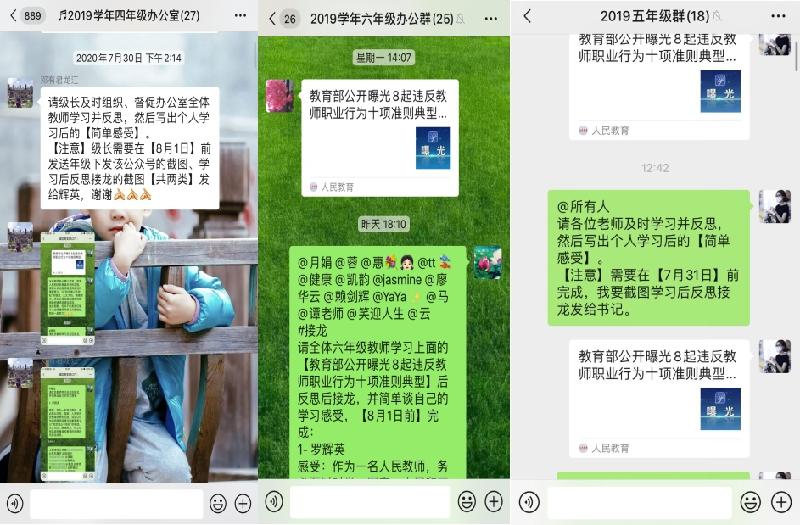 師者,以德為先”。高尚的師德師風(fēng)是教師從事教育工作的靈魂。為了進(jìn)一步加強(qiáng)教師隊(duì)伍建設(shè),不斷提高教師職業(yè)道德素質(zhì)和師德修養(yǎng),保障全體教師在良好師德師風(fēng)塑造和學(xué)習(xí)中的不松懈和持續(xù)性,7月27-30日,在暑假期間,龍江城區(qū)中心小學(xué)組織全體教師在線上重點(diǎn)學(xué)習(xí)了“教育部公開曝光8起違反教師職業(yè)行為十項(xiàng)準(zhǔn)則典型問題”一文,并進(jìn)行了自我反思和學(xué)習(xí)心得的分享交流。