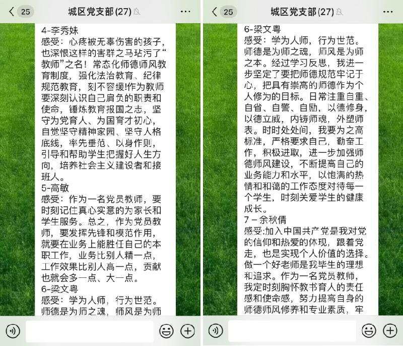 “師者,以德為先”。高尚的師德師風(fēng)是教師從事教育工作的靈魂。為了進(jìn)一步加強(qiáng)教師隊(duì)伍建設(shè),不斷提高教師職業(yè)道德素質(zhì)和師德修養(yǎng),保障全體教師在良好師德師風(fēng)塑造和學(xué)習(xí)中的不松懈和持續(xù)性,7月27日-30日,在暑假期間,龍江城區(qū)中心小學(xué)組織全體教師在線上重點(diǎn)學(xué)習(xí)了“教育部公開(kāi)曝光8起違反教師職業(yè)行為十項(xiàng)準(zhǔn)則典型問(wèn)題”一文,并進(jìn)行了自我反思和學(xué)習(xí)心得的分享交流。