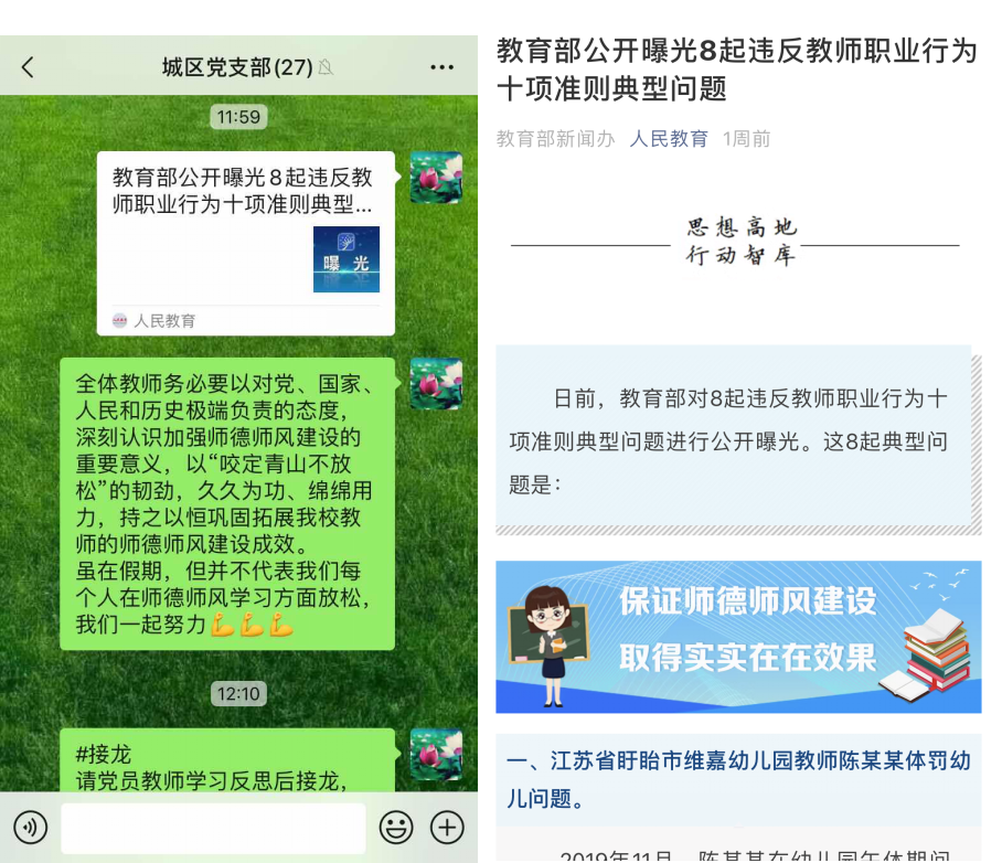 “師者,以德為先”。高尚的師德師風(fēng)是教師從事教育工作的靈魂。為了進(jìn)一步加強(qiáng)教師隊(duì)伍建設(shè),不斷提高教師職業(yè)道德素質(zhì)和師德修養(yǎng),保障全體教師在良好師德師風(fēng)塑造和學(xué)習(xí)中的不松懈和持續(xù)性,7月27日-30日,在暑假期間,龍江城區(qū)中心小學(xué)組織全體教師在線上重點(diǎn)學(xué)習(xí)了“教育部公開曝光8起違反教師職業(yè)行為十項(xiàng)準(zhǔn)則典型問題”一文,并進(jìn)行了自我反思和學(xué)習(xí)心得的分享交流。