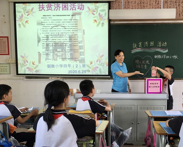 2020年6月28日,弼教小學大隊輔導員張敏靈在校園廣播及微信公號向全校師生發(fā)出倡議:伸出您的援助之手,奉獻您的一份愛心,送上您的一份真情,貢獻您的一份力量,點燃貧困家庭的一份希望,讓那些在困難中的人們感受到溫暖,得到幫助,早日擺脫困境,過上幸福的生活。倡議發(fā)出后,弼教小學師生踴躍參與,奉獻愛心。