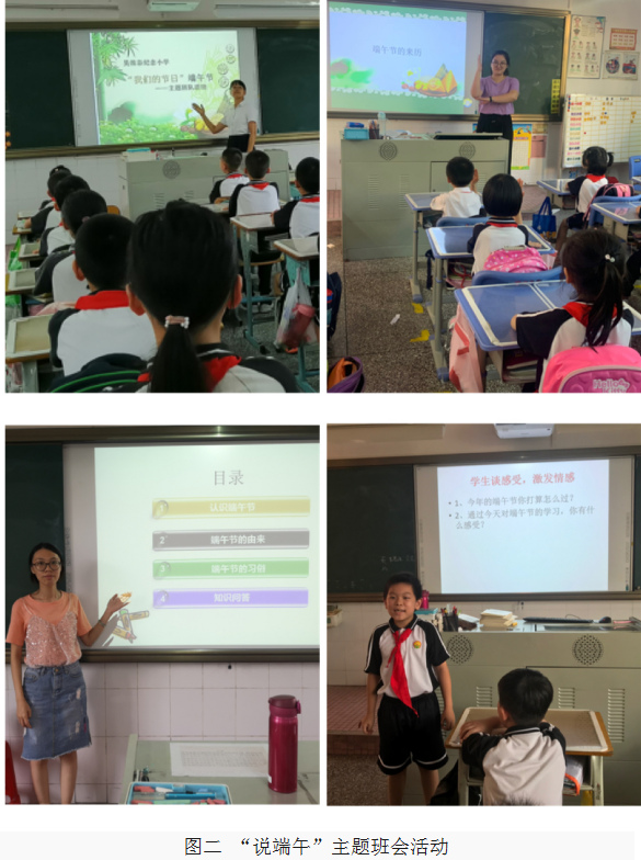 各中隊(duì)以“我們的節(jié)日?端午節(jié)”為主題開展隊(duì)活動(dòng)課。在輔導(dǎo)員老師的指導(dǎo)下,各中隊(duì)精心準(zhǔn)備,從端午的起源、習(xí)俗、諺語、民俗故事暢談了對(duì)端午的認(rèn)識(shí),通過誦讀屈原的經(jīng)典名句,感受到了端午節(jié)的文化內(nèi)涵,體驗(yàn)了我國傳統(tǒng)節(jié)日的獨(dú)特魅力。