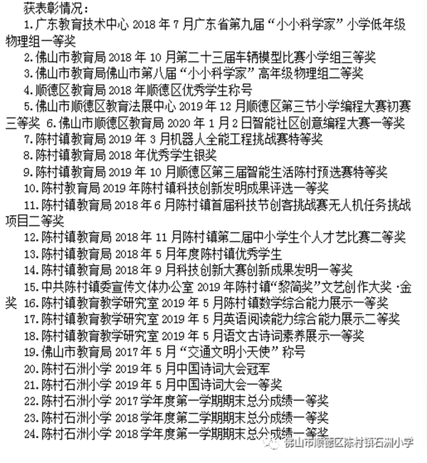 唐湘同學樂于助人、熱愛集體、具有良好的思想品質(zhì),是同學中的佼佼者。曾獲陳村鎮(zhèn)“優(yōu)秀少先隊員”稱號;陳村鎮(zhèn)科技創(chuàng)新大賽科幻繪畫作品評選獲一等獎;“共筑家園”全國青少年建筑模型(佛山賽區(qū))競賽暨佛山市第十七屆中小學生建筑模型比賽二等獎;“共筑家園”全國青少年建筑模型(佛山賽區(qū))競賽暨佛山市第十八屆中小學生建筑模型比賽二等獎;第二十四屆“駕馭未來”全國青少年車輛模型(佛山賽區(qū))競賽暨佛山市第二十三屆中小學生車輛模型比賽二等獎。