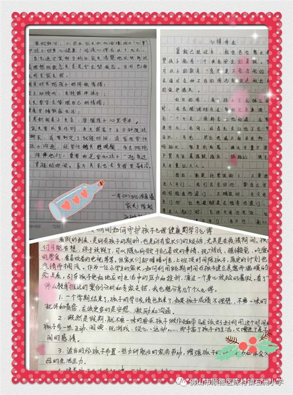 班主任們根據(jù)佛山市守護師生身心健康項目推送的小學系列專業(yè)宣傳推文,及時為家長送上最新鮮的資訊,指導家長履行職責,暑假期間守護孩子的心理健康。家長們通過學習推文中的“案例呈現(xiàn)”、“案例解剖”、“專家支招”等內(nèi)容,為孩子營造溫馨祥和的家庭氛圍,有效地培養(yǎng)孩子的積極情緒,建立和諧的親子關系。