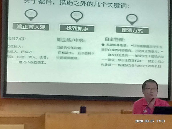 眾所周知,教學(xué)質(zhì)量是一間學(xué)校的生命線,如何提高教學(xué)質(zhì)量是我們每一位教師時刻都在研究的;教育的本質(zhì)是促進生命的成長,作為教師,不僅僅是向?qū)W生傳授知識以及學(xué)習(xí)知識的方法,還需不斷自我提升、進步和成長。為進一步提升教師思想和業(yè)務(wù)素質(zhì),扎實開展課堂改革與創(chuàng)新,使教師的理論素養(yǎng)和實踐能力再上一層樓,謝文忠校長于2020年9月7日下午在全體教師政治業(yè)務(wù)學(xué)習(xí)會議上作了《關(guān)于教學(xué)質(zhì)量的思考》的專題講座。