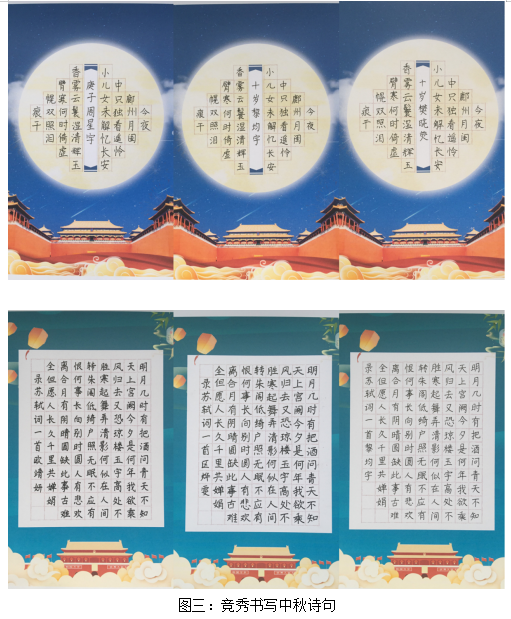 競(jìng)秀書法和競(jìng)秀繪畫比賽。學(xué)生通過(guò)認(rèn)真書寫和描繪有關(guān)中秋、國(guó)慶的故事和詩(shī)篇中進(jìn)一步解讀傳統(tǒng)節(jié)日的韻味和無(wú)窮魅力。隊(duì)員們所寫的方塊漢字一一道出了中秋的美好、團(tuán)圓和國(guó)慶的喜悅、祝福。隊(duì)員們?cè)谛沱惖奈淖峙c色彩斑斕的圖畫中放飛夢(mèng)想,深情地祝福我們偉大的祖國(guó)繁榮昌盛!