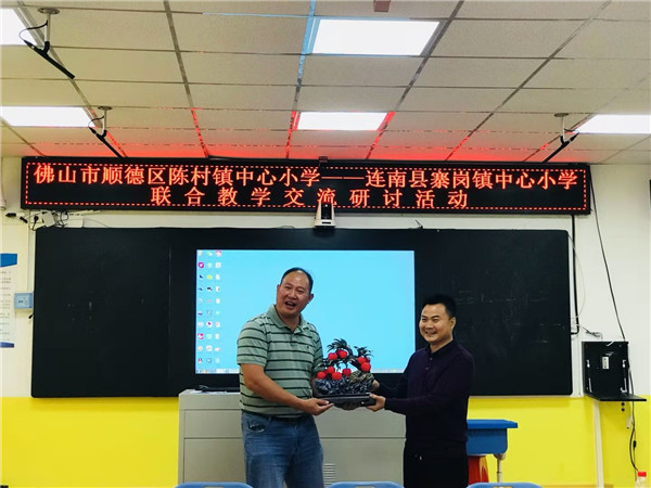 2019學(xué)年陳村鎮(zhèn)中心小學(xué)鄧金山老師赴連南寨崗鎮(zhèn)中心小學(xué)支教。一年下來,鄧?yán)蠋煵坏殃惔彐?zhèn)中心小學(xué)“和潤教育”的先進(jìn)教育理念和課改模式帶到寨崗鎮(zhèn)中心小學(xué)里,而且還把兩校合作互進(jìn)的友誼種子深深埋下。