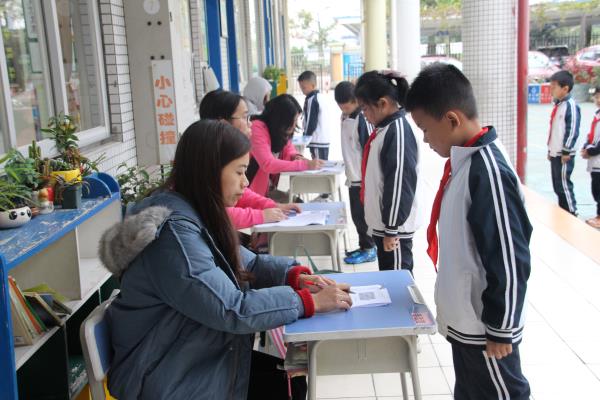 第二部分的考核在十六周一下午進行,語數(shù)英三科同時考核。三至六年級的考核形式是三科綜合筆試,一、二年級則是通過各科組的評委老師到各班進行現(xiàn)場口語考查。寒意驟至,考核活動卻是如火如荼地進行著,三至六年級的學(xué)生們端坐在教室里奮筆疾書,一、二年級的小朋友們則在所有考核老師的組織下,有的在課室認(rèn)真聆聽故事;有的在老師指揮下排著整體的隊伍;有的在不同學(xué)科的老師面前奶聲奶氣地回答著各科的問題。稚態(tài)可掬的口述,還不忘禮貌地問好,配上那可愛的笑容,又是“素養(yǎng)”的另一道風(fēng)景。