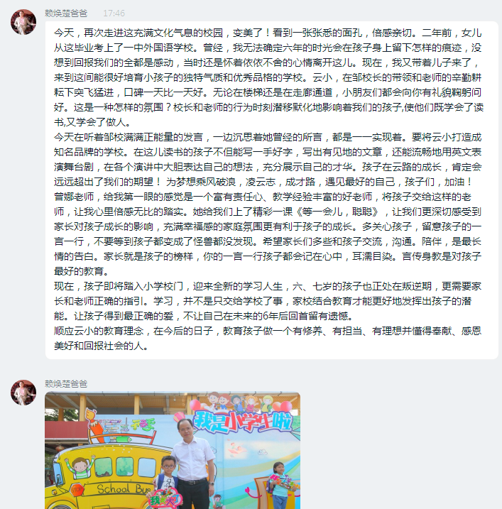 “今天的家長會有特別多的感動,整場下來熱淚盈眶,之前因為對學(xué)校的不了解,心中多少有些迷茫,但是今天聽完鄒校長對學(xué)校教育理念的講解和看到優(yōu)秀的教師團(tuán)隊,我愛上了這所學(xué)校,鑫誠很幸運能進(jìn)入這個友愛和溫暖的大家庭”