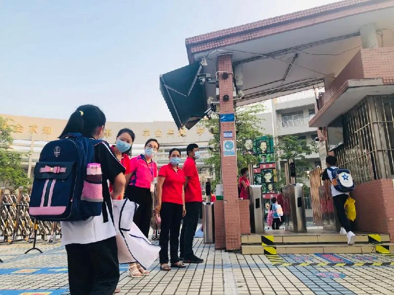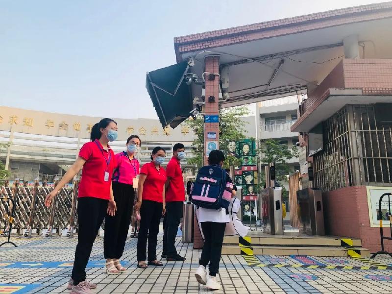 廖校長(zhǎng)帶領(lǐng)行政們、值日老師和家長(zhǎng)義工在校門(mén)口用最美的微笑和親切的問(wèn)候迎接一張張可愛(ài)的笑臉。學(xué)生們興高采烈地、滿(mǎn)懷期待地進(jìn)入校園。瞧,多想快些見(jiàn)到老師和同學(xué)們,簡(jiǎn)直是健步如飛呀!