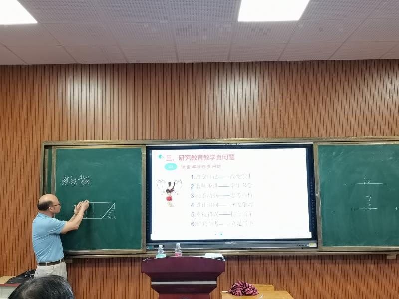 第二部分,鄧老師為所有的數(shù)學老師們開展了以“研究教育教學真問題”為主題的專題講座,特別提到三個方面:(一)是研究教材備好課,建議老師們從6個方面去研究,編者意圖,知識技能,前后聯(lián)系,教育價值,學生情況,學法教法,講到教法時,還展示了今年的中考題,以具體的題目來親自示范,對于他提到的方法,讓老師們大開眼界;(二)注重解決自身問題,從6個方面給老師們提供了很好的建議,改變自己,教師少講,動手動腦,設(shè)計追問,重視錯誤,研究中考;(三)科研課題從哪里來?從教育教學實際問題中來,從各級各類課題指南中來,從他人課題名稱中來。無論是哪一方面,鄧老師講的都很接地氣,老師們都聽得非常認真,收獲很多。