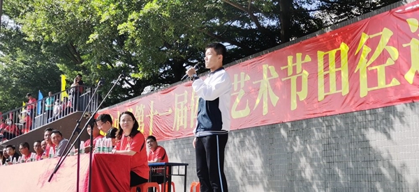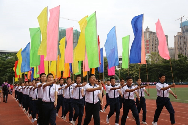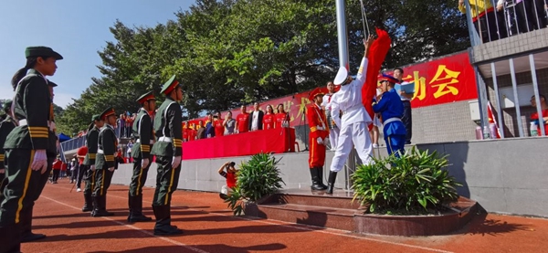 隨后,全體嘉賓與順中師生一道進(jìn)行莊嚴(yán)的升旗儀式。在全場(chǎng)唱響嘹亮的國(guó)歌后,孫蓉姬副校長(zhǎng)上臺(tái)致開(kāi)幕辭。最后,潘惠紅校長(zhǎng)正式宣布順?lè)逯袑W(xué)第十一屆體育藝術(shù)節(jié)開(kāi)幕。在一片掌聲和歡呼聲中,開(kāi)幕式被推向高潮!